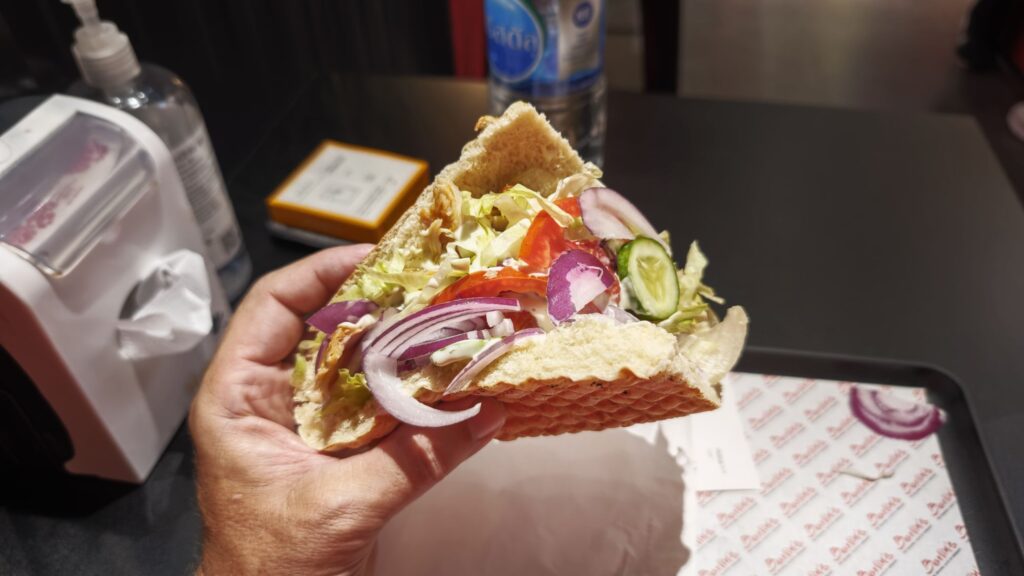 I work in the afternoons so my dinner is usually fast. This is a Turkish chicken kebab at Berlin – a German restaurant.